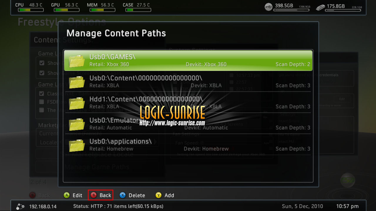 - Quand je scan pour un répertoire (Exemple pour les jeux 360 Usb0:GAMES) j'ai aussi ces répertoires la : Flash:GAMES et HddX:GAMES et sa me le fait pour tout XBLA Application Jeux XBOX1 et Homebrews, sauf si je sélectionne pour les jeux XBLA sur le disque dur officiel 360 la j'ai bien que le répertoire Hdd1:Content?000000000000000, je vérifie que tout est bien placer dans chaque catégorie c'est nikel tout est a sa place et lorsque je reboot et que je retourne voir dans les diffèrent menu, j'ai tout en triple, quelqu'un peut m'aidez? svp, merci.