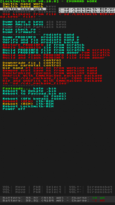 Et se n'est pas terminé, contrairement à tous les payloads sur lesquels il est basé celui-ci fonctionne sur une plus large quantité de configurations, notamment d'anciennes configurations basées sur des puces utilisant Spacecraft qui pouvaient poser des problèmes dès qu'on souhaitait travailler sur ou avec la nand (emunand ou sysnand qu'importe). Bien sûr le payload peut travailler sur la sysnand, sur l'emunand d'Atmosphere mais aussi sur les emunands basées sur la variable "emupath" dans les configs de Hekate (fonction qui n'a pas été testée), dans le cas de plusieurs emunands configurées correctement sur la SD un choix devrait pouvoir se faire pour sélectionner l'emunand sur laquelle travailler. Il peut aussi, comme TegraExplorer, utiliser un fichier de clés pour charger les clés à utiliser pour déchiffrer les nands, pratique si par exemple vous utilisez une nand d'une autre console que vous auriez besoin de débricker.